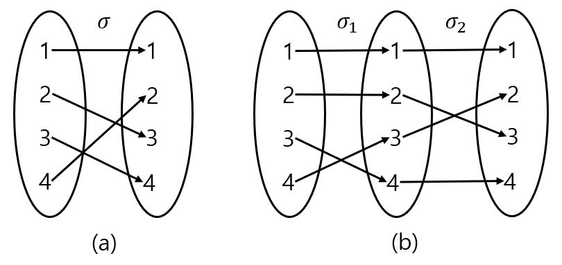 즉, \(\sigma = \tau_1 \tau_2 \cdots \tau_m\) 으로 분해하여 표현할 수 있다. 여기서 각 $\tau_i$는 어떤 두 원소의 교환이다.
