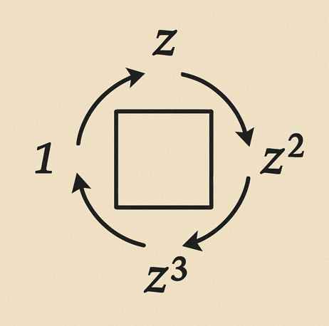 여담으로, 이 군은 순환군(Cyclic Group)이라고 불리며, 원소 n개짜리 순환군은 보통 $C_n$으로 표기한다. 이 경우에는 원소가 4개이므로 $C_4$라고 부른다.