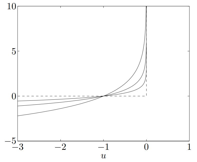 위 조건에 전부 부합하면서 미분도 쉬운 함수 중 하나가 바로 log barrier function이며, 다음과 같다 :