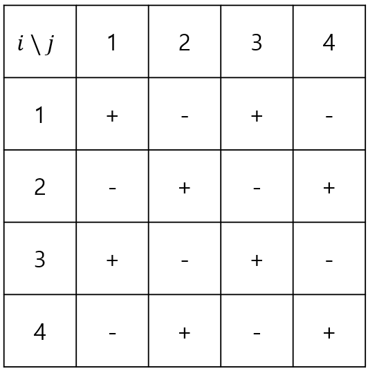 좀 더 수식화 하면, 각 칸의 좌표 $(a, b)$에서, $a + b$가 짝수이면 +, 홀수이면 -가 붙으므로, 다음과 같이 표현할 수 있다 :