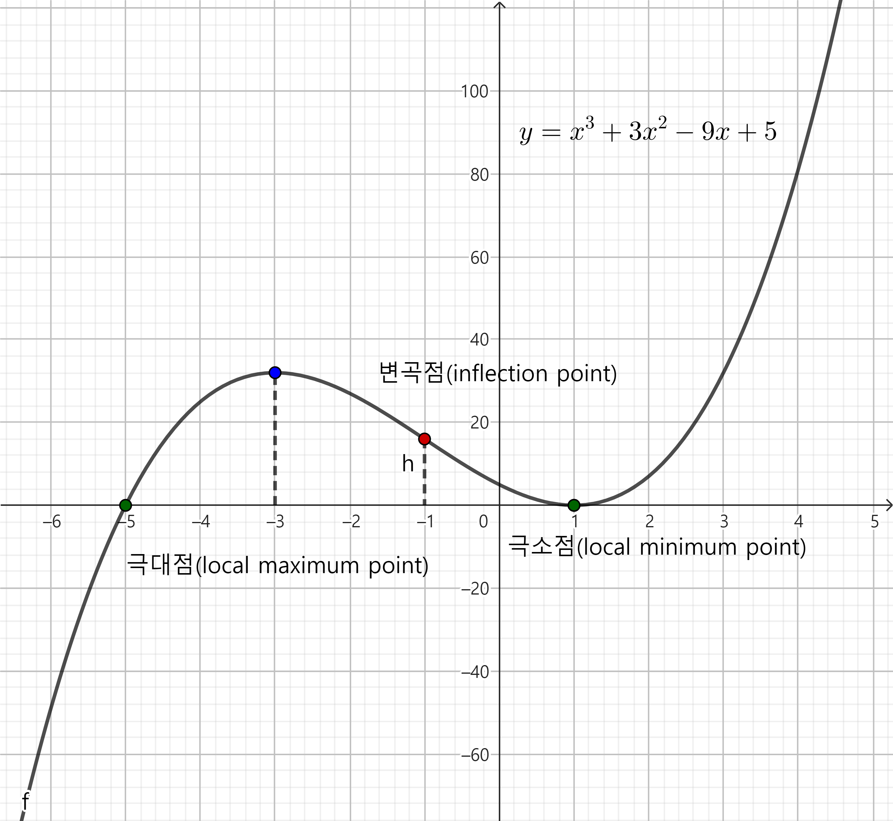 \[\begin{align} y'(x)=0, \begin{cases} y''(x) > 0 & \text{ : 극소(local minimum point)} \\ y''(x) < 0 & \text{ : 극대(local maximum point)} \\ y''(x) = 0 & \text{ : 변곡점(inflection point)} \end{cases} \end{align}\]