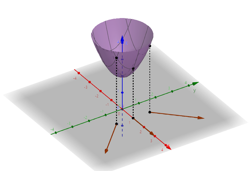 위에서 내려다본 $f=x^2 + y^2 + 2$의 그래프와 그라디언트 벡터