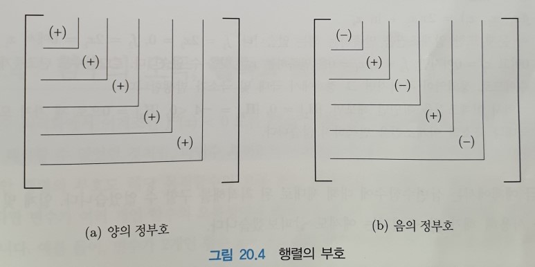 다른 이해 방식은 다변수함수의 2차항의 부호로 생각하는 방법도 있다. 예를 들어 $f(a,b,c) = 2a^2 + 5b^2 + c^2 -4ab - 2bc$는,$(a,b,c) \neq 0$이면 $f > 0$을 만족하는데, 이를 완전제곱식의 합과, 행렬로 동시에 표현하면 다음과 같다 :