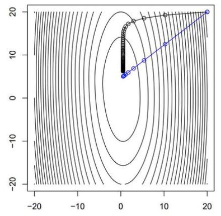 반대로 gradient descent 방법은 affine 변환에 상관이 있어서 좌표계의 구조에 따라 수렴 속도가 달라지기도 한다.