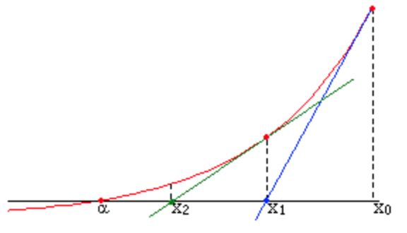 \[\begin{align} x_{x+1} = x_{k}-\frac{f(x_{k})}{f'(x_k)} \end{align}\]이는 점 $(x_k, f(x_k))$에서 접선을 그린 후, 그 접선이 $x$ 축과 만나는 점을 $x_{k+1}$로 삼는 것과 동일하다.