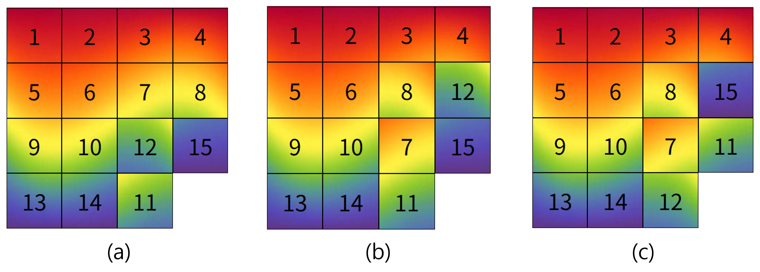 그림 5 : 슬라이딩 퍼즐의 합성. (a)가 $g_1$, (b)가 $g_2$, (c)가 $g_2 \circ g_1$을 의미한다.
