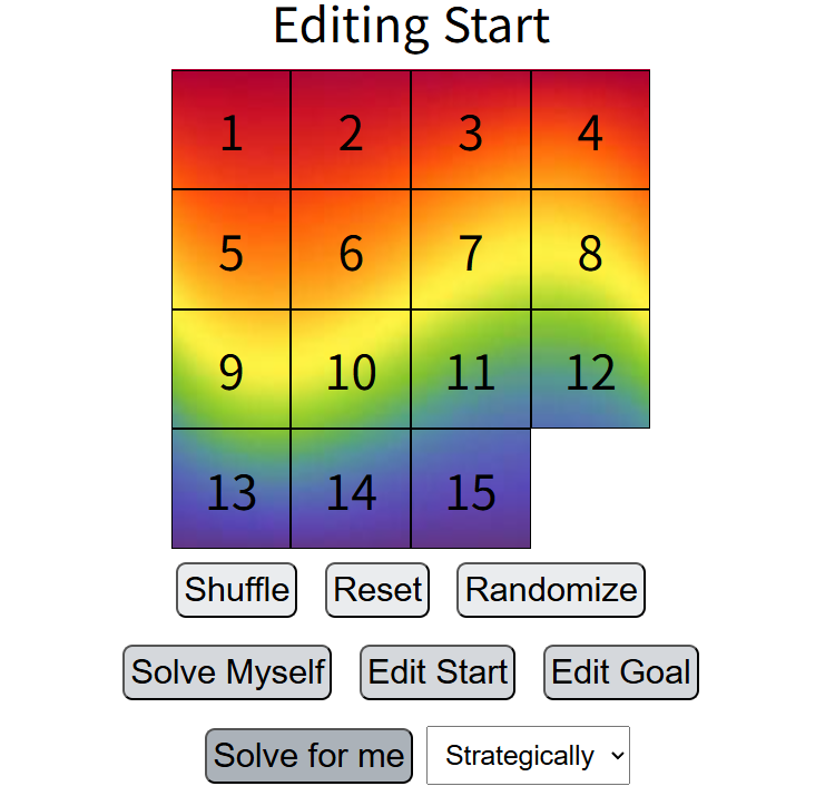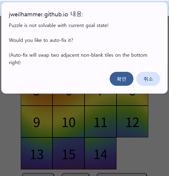 이후 해당 사이트에서 shuffle을 눌러 아무렇게나 퍼즐을 섞은 뒤, 다양하게 조각들을 교환한 다음 unsolvable(해결 불가능) 경고가 뜨는지 확인했다.