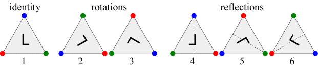 예를 들어, 정삼각형은 0도, 120도, 240도 회전과 좌우 대칭을 포함한 6가지의 대칭을 유지하는 변환들을 가진다.