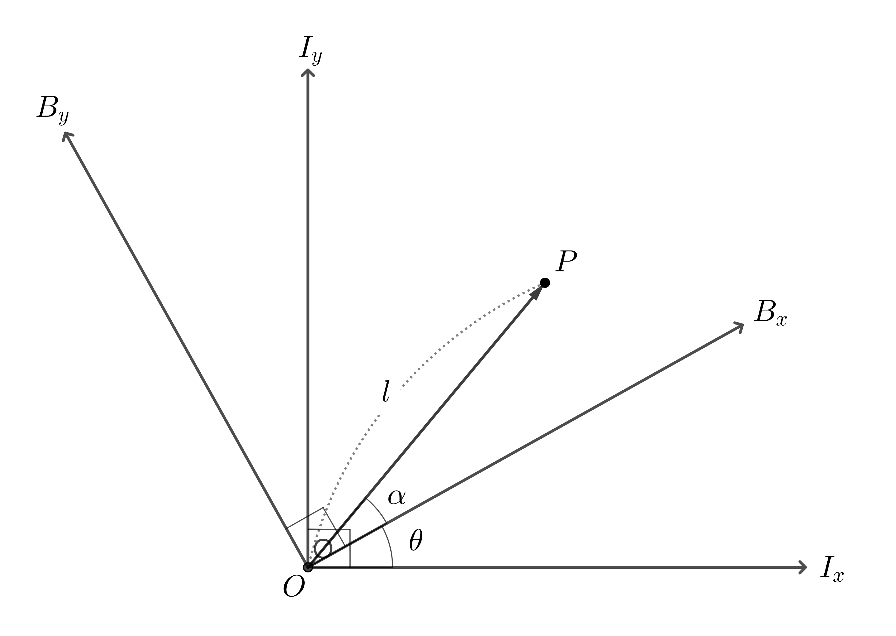 \[\begin{equation} P_I = l \begin{bmatrix} \cos{\alpha + \theta} \\ \sin{\alpha + \theta} \end{bmatrix} \label{e1}\end{equation}\]이번엔 $B$ 좌표계의 입장에서 보면, 점 $P$는 길이가 $l$이고 각도는 $\alpha$이다. 이는 극좌표 형식으로 다음과 같이 표현할 수 있다.