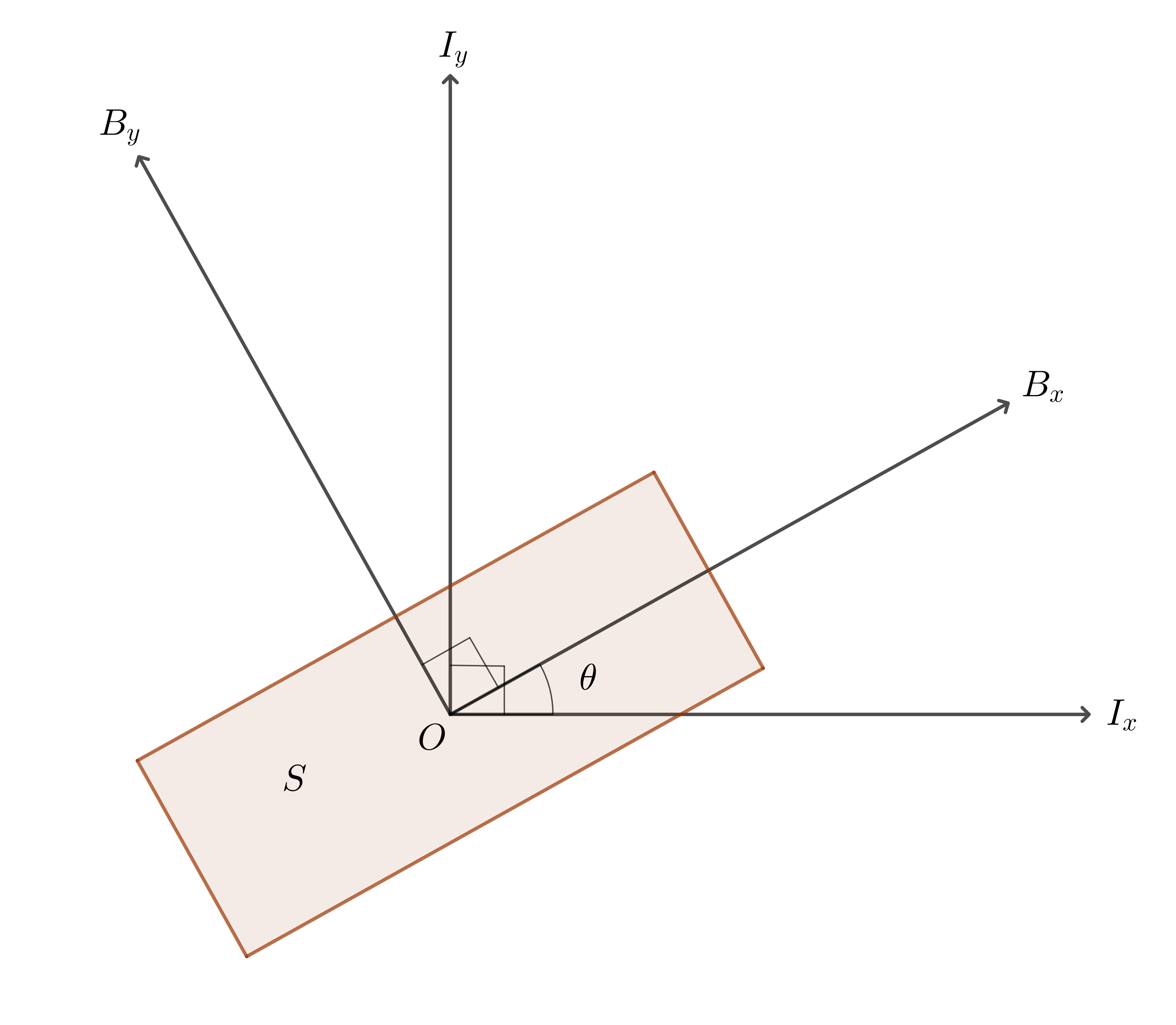 $I$ frame의 $x,y$방향 단위 축 벡터를 $i_x, i_y$, $B$ frame의 $x,y$방향 단위 축 벡터를 $b_x, b_y$ 하자. 따라서 $\left\Vert\vec{i_x}\right\Vert = \left\Vert\vec{i_y}\right\Vert = \left\Vert\vec{b_x}\right\Vert = \left\Vert\vec{b_x}\right\Vert = 1$이며, $\vec{i_x} \bot \vec{i_y}$, $\vec{b_x} \bot \vec{b_y}$ 이다.